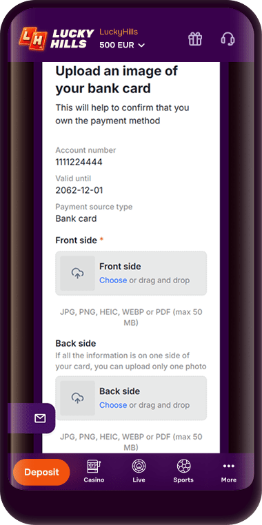 Note: you’ll access payment verification only after uploading documents for identity - Upload the photos of 2 sides of your bank card